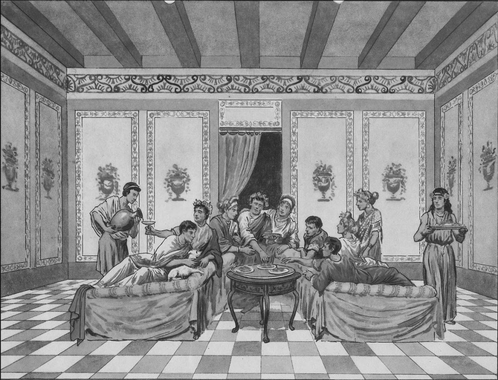 古代ローマの上流階級は、「トリクリニウム(triclinium)」と呼ばれる宴会場で、寝椅子に横たわりながら食事を楽しんでました。🍷✨